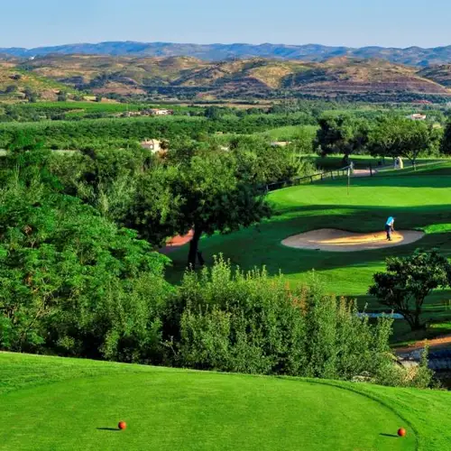 Key Features: Panoramic views across the river into Spain, challenging elevated greens, and a peaceful parkland setting surrounded by pine and olive trees.